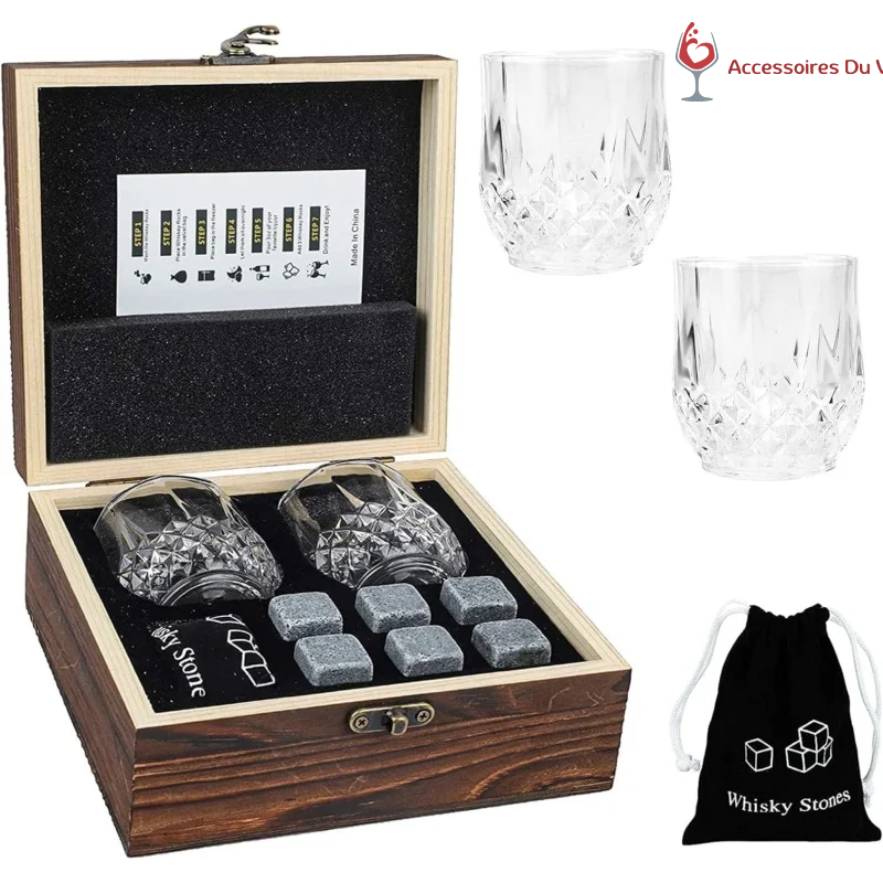 L’ensemble se compose de deux verres à whisky, de six pierres rafraîchissantes en granit naturel, d’un sac de rangement en flanelle, le tout présenté dans une boîte en bois conçue pour accueillir chaque élément de manière ordonnée. Chaque pièce dispose de son emplacement dédié, ce qui facilite aussi bien le rangement que la présentation.