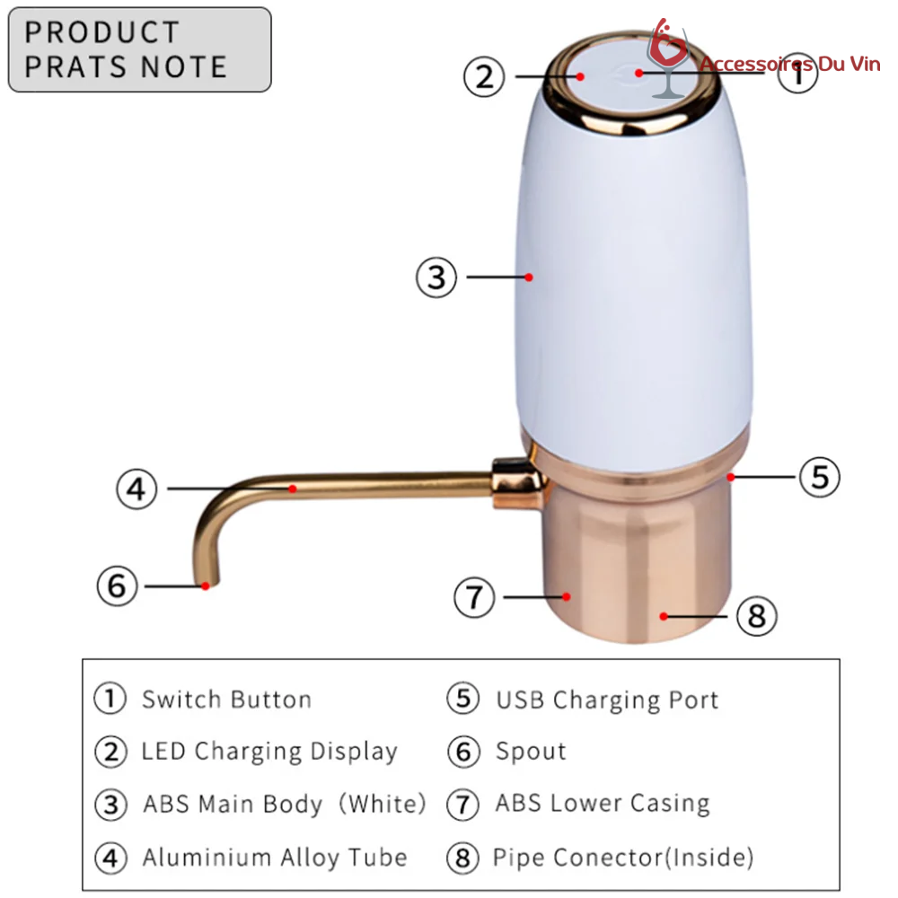 Lorsqu’on observe l’aérateur de vin électrique, on retrouve une silhouette moderne composée d’un corps lisse, d’un bec verseur incurvé en métal et d’une base inférieure qui accueille le raccord de la tige. L’ensemble est pensé pour être ergonomique : une seule main suffit pour mettre l’appareil en place et pour activer le service. Il suffit de fixer la tige fournie, de placer l’aérateur sur le goulot de la bouteille puis d’appuyer sur le bouton supérieur. Le vin s’écoule alors en douceur dans le verre, avec une constance impossible à obtenir manuellement.