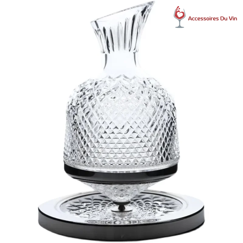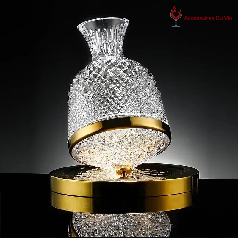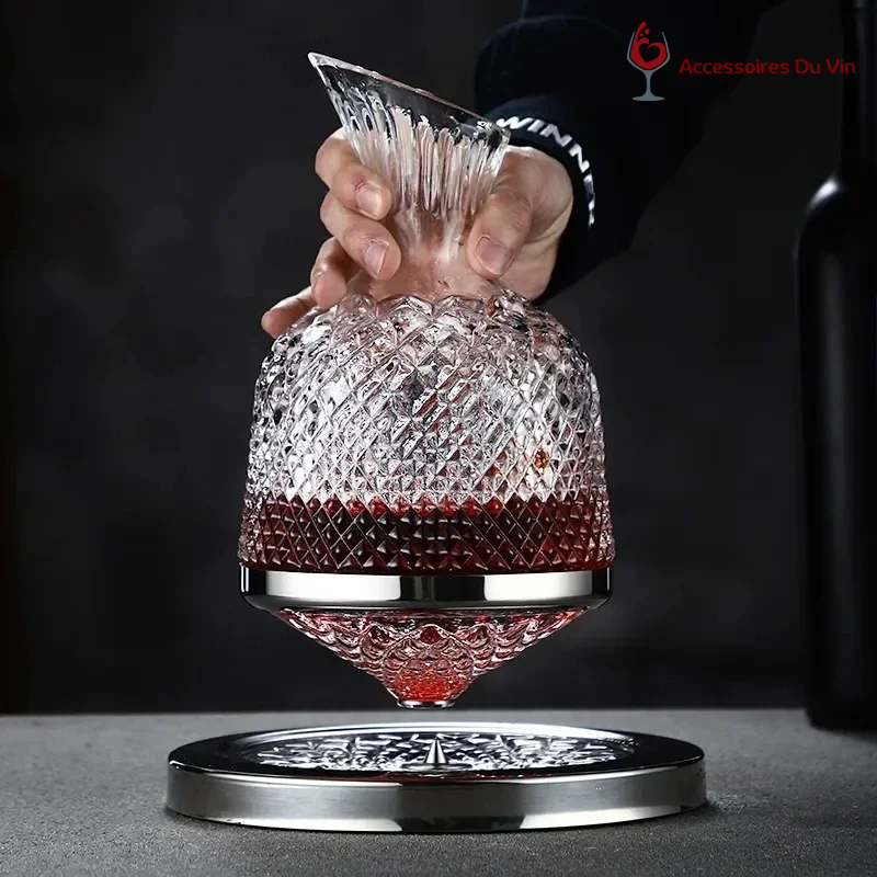 Mais contrairement à la plupart des carafes décoratives, celle-ci n’est pas qu’un bel objet à regarder. La rotation 360° amplifie le mouvement du vin et multiplie les échanges avec l’air. Au lieu de reposer dans une position fixe, le vin glisse, remonte légèrement, puis redescend. Ce mouvement constant permet à ses arômes de se libérer plus rapidement et plus complètement que dans une carafe statique. On ne parle pas ici d’aération classique : la sensation est beaucoup plus dynamique.