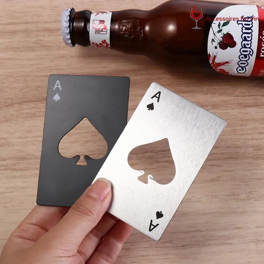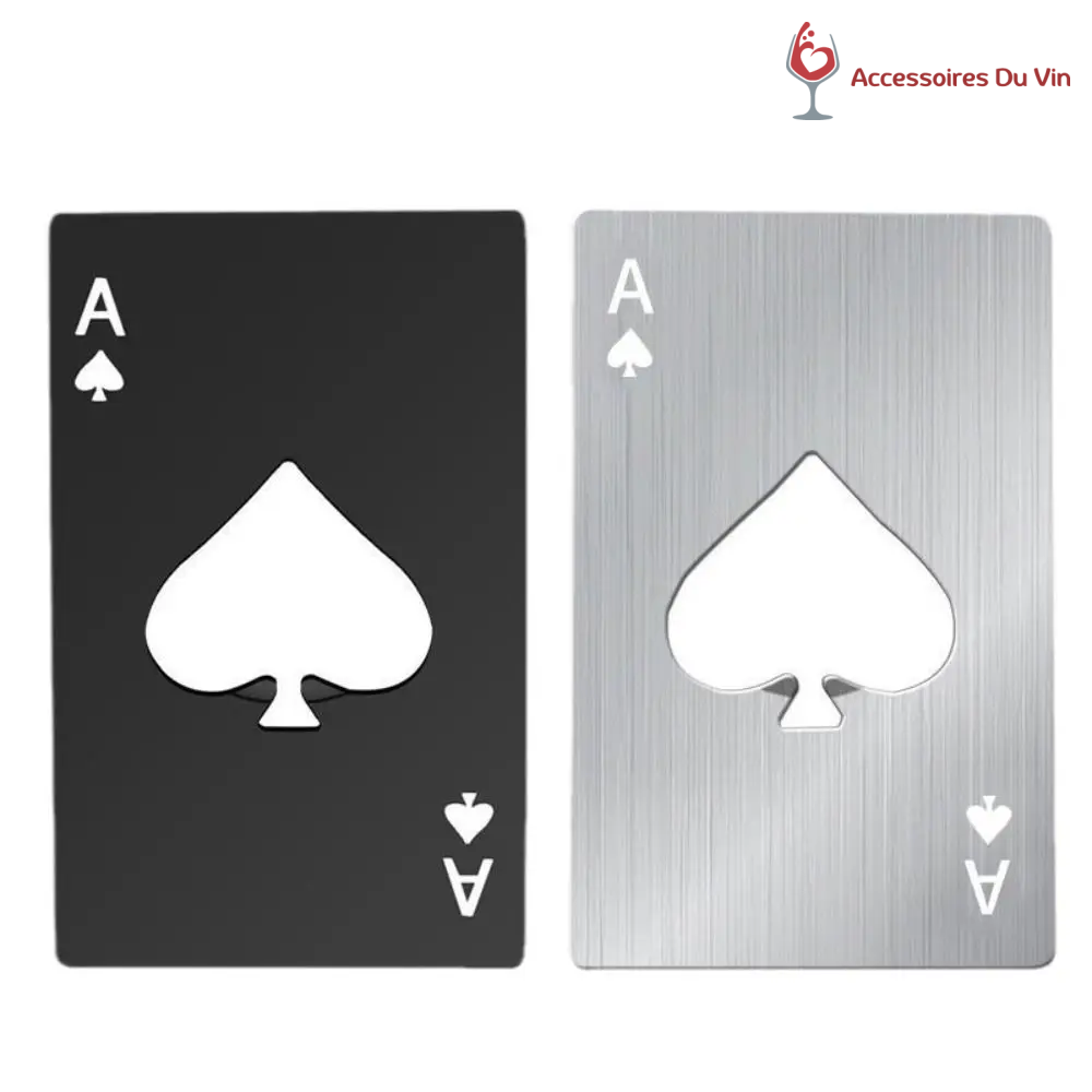 La conception plate de l’objet permet aussi une manipulation confortable. Ses angles arrondis évitent les accrocs et permettent de le tenir fermement. Le choix de l’As de pique comme visuel principal apporte une touche identifiable sans nuire à la fonctionnalité. Les symboles imprimés correspondent simplement à un design illustratif, sans incidence sur l’usage. La découpe centrale, quant à elle, est strictement fonctionnelle et adaptée au geste de décapsulage.